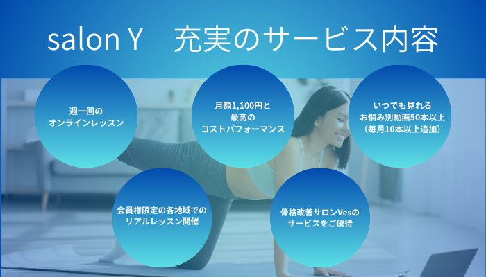入会の流れは簡単です!詳細はこちらからご覧ください。入会方法はこちらからサロン Yで提供する内容とは?充実の内容サロンの内容✓週一回のエクササイズ・ストレッチライブ