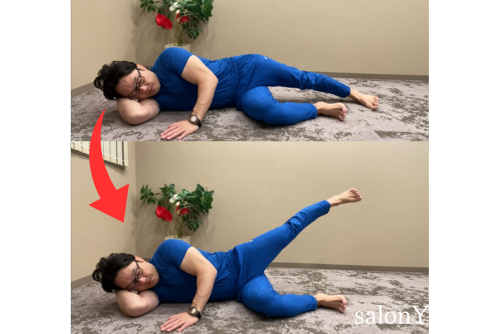 - 両ひざを曲げて横になり、右腕を枕にして、左腕を床について体を安定させる