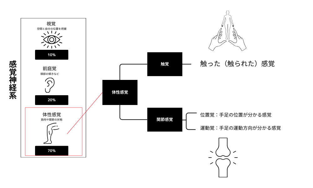 | 感覚神経と割合 10% 視覚(自分の位置を把握) 20% 前庭覚(頭部の傾きを把握) 70% 体性感覚(筋肉や関節の状態を確認) |